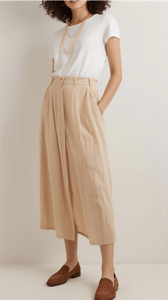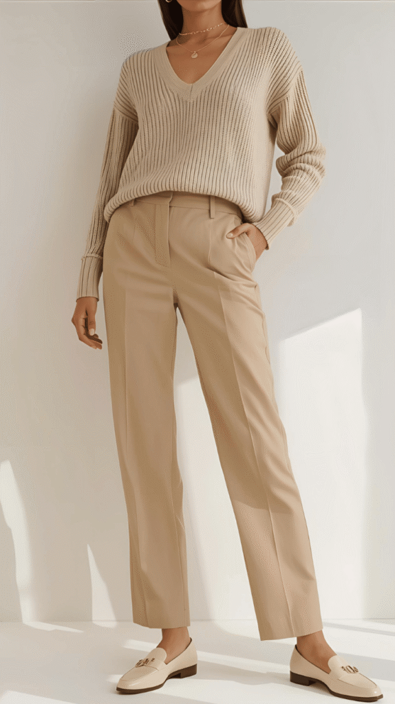 You can also dress this look up with accessories. A sleek belt, a gold necklace, or a soft cardigan over your shoulders can transform this simple base into something polished enough for meetings or a nice lunch out. The key is keeping the color palette soft and neutral so everything feels cohesive.