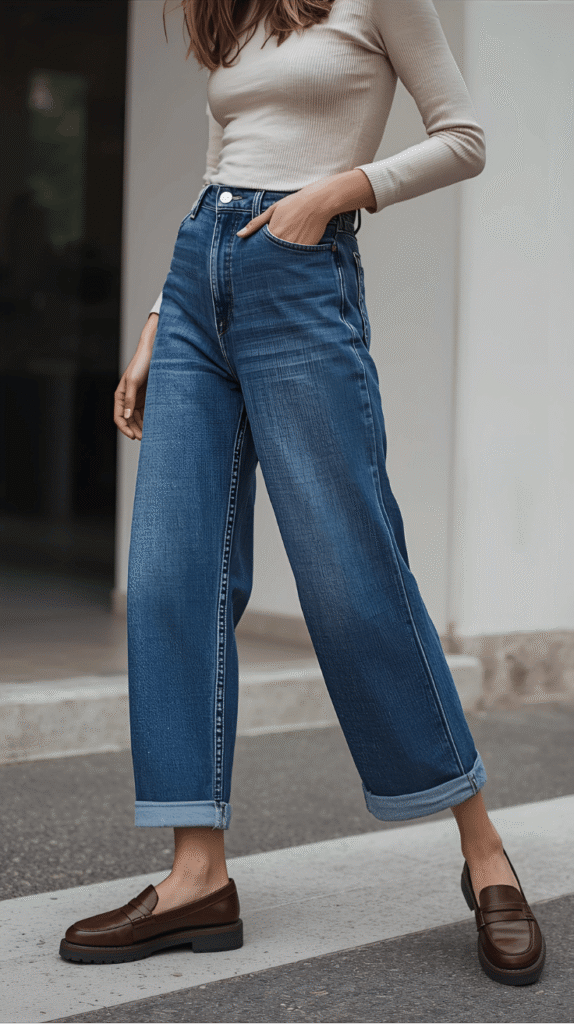 This combination pairs beautifully with platform loafers, because the extra height helps balance the volume of the wide-leg denim. A simple black or tan loafer keeps the attention on the jeans while still bringing structure to the outfit.