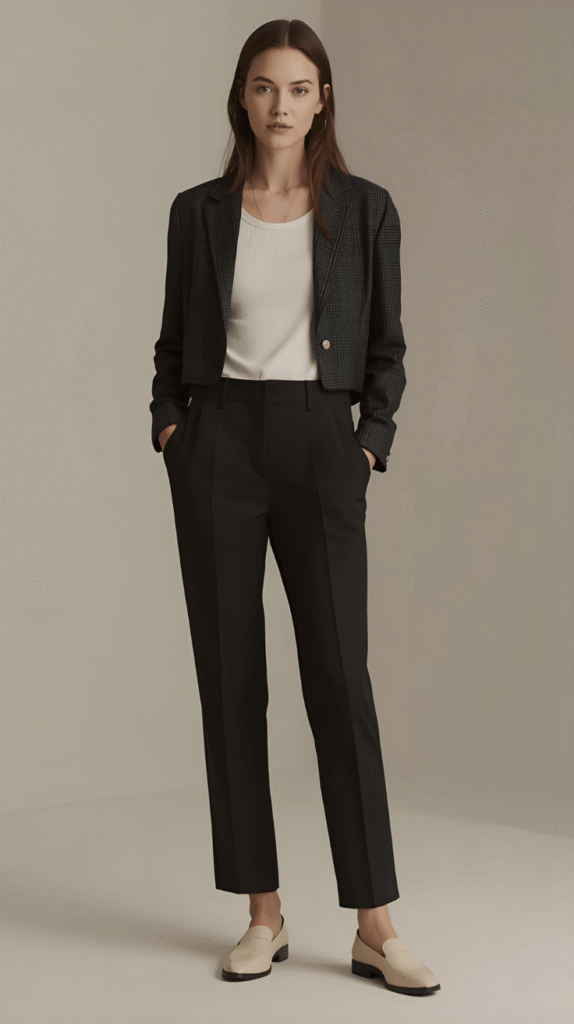 A cropped jacket paired with straight-leg pants creates a balanced, flattering silhouette that works beautifully with loafers. The shorter jacket length highlights your waist and gives your outfit a structured, modern feel. Straight pants keep things sleek, and loafers add the perfect grounded touch.