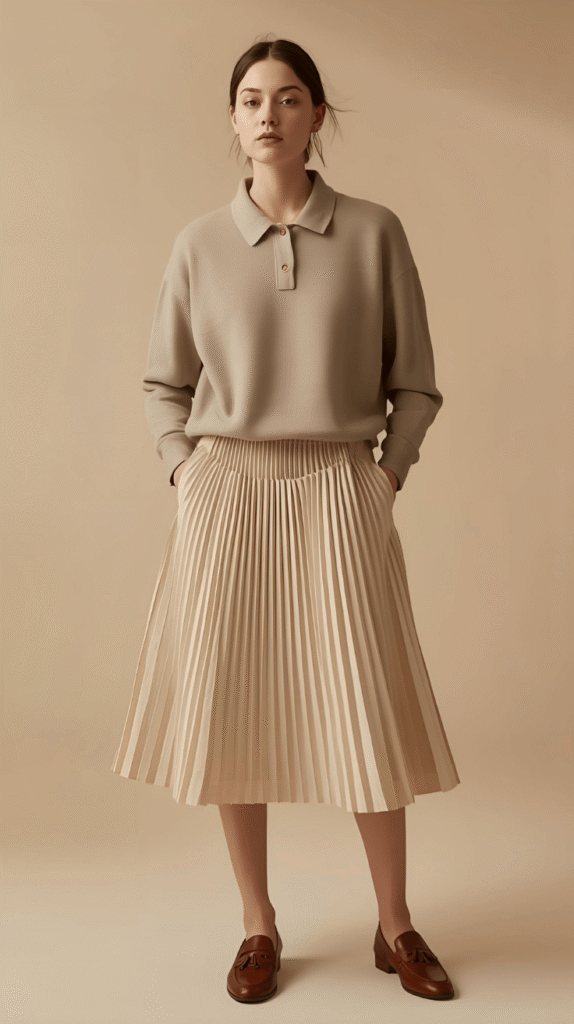 A polo sweater paired with a pleated skirt creates a sporty yet polished outfit that feels feminine, preppy, and incredibly fresh. The structured collar on the sweater adds a touch of formality, while the flowing skirt keeps the outfit playful and flattering.