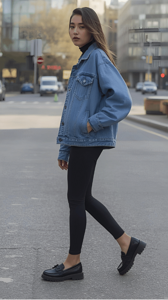 An oversized denim jacket paired with leggings is one of the easiest casual outfits you can throw on, and loafers instantly make it look more styled and intentional. The denim adds structure on top, the leggings keep things sleek on the bottom, and the loafers add that polished touch that elevates the entire look.