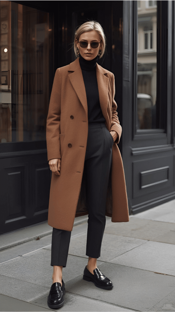 A wool midi coat paired with tailored trousers creates one of the most timeless, expensive-looking outfits you can wear. The coat gives the look structure and presence, while the trousers refine the silhouette. When you add loafers, the outfit becomes both practical and effortlessly chic.