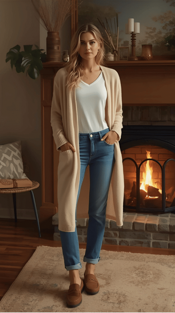 A longline cardigan paired with jeans is one of those outfits that always feels cozy yet put together. The cardigan adds softness and movement, while the jeans ground the outfit and keep it casual. Loafers elevate the combination with a polished, feminine touch.