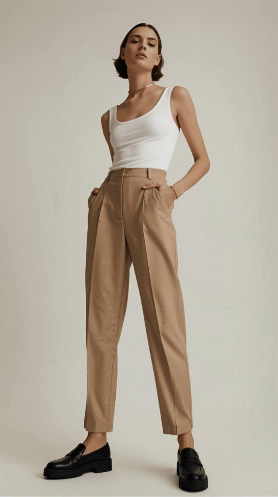 Neutral trousers paired with a fitted tank create one of the easiest “I look put together without trying” outfits. The simplicity of the tank keeps the look casual and modern, while the structured trousers instantly elevate everything. When you add loafers, the outfit becomes even more balanced and flattering.