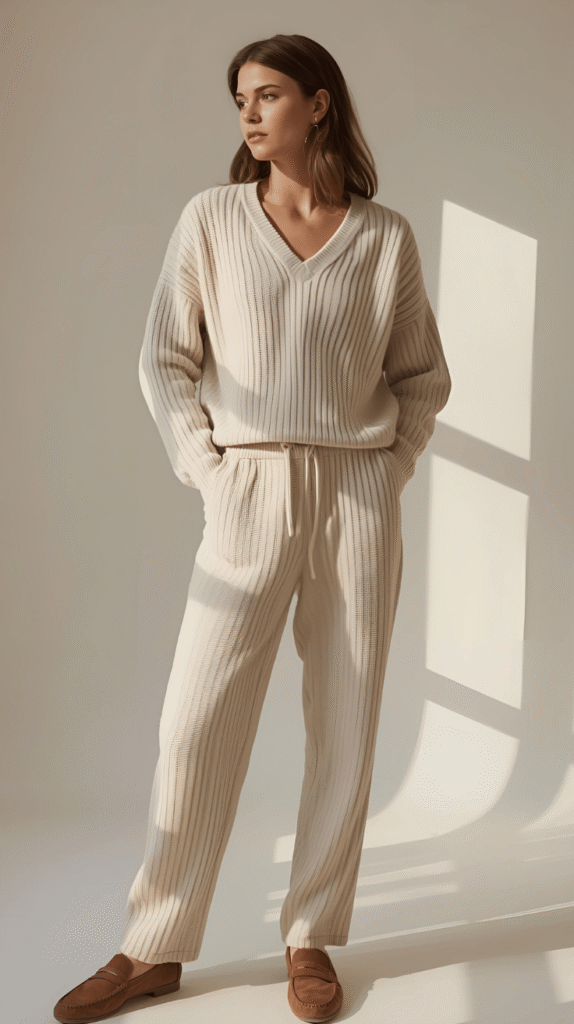 This pairing works beautifully with suede loafers, because the soft finish complements the knit material perfectly. Whether you go for beige, oatmeal, or a soft grey set, suede loafers make the outfit look intentional and elevated.