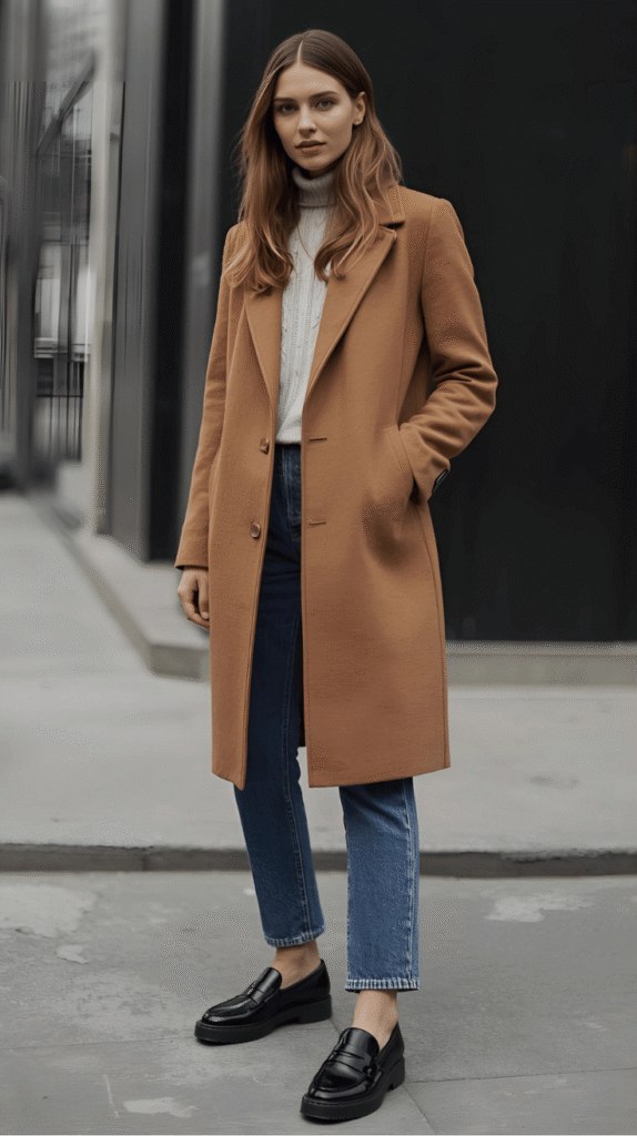 You can layer anything underneath: a turtleneck, a knit top, or even a lightweight blouse. The coat does most of the visual work, giving the outfit that sleek winter look women love. Loafers add just the right amount of modernity while keeping everything comfortable.