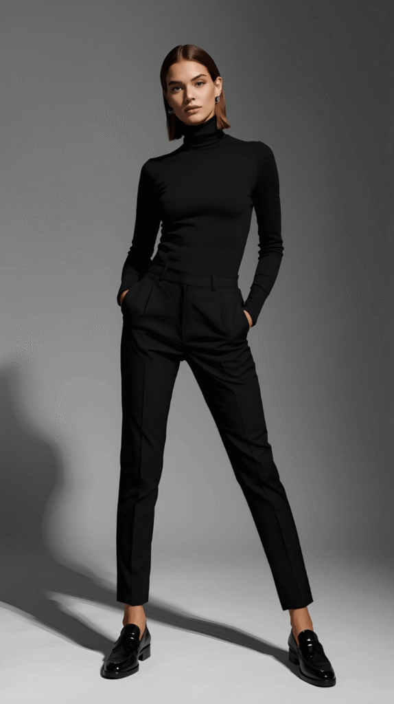 You can also try this with darker tones. A black turtleneck with black tailored pants and black loafers creates a sleek silhouette that instantly feels refined. It is simple, timeless, and perfect for transitional seasons when you want to look elevated without overthinking.